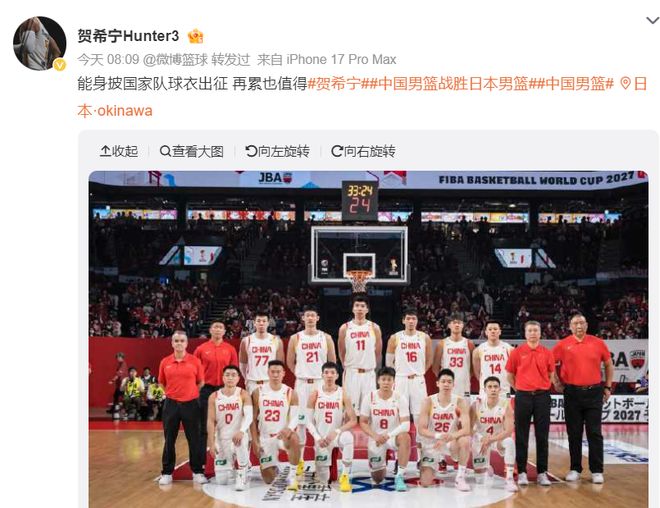 北京时间2月27日晨,中国男篮后卫贺希宁在社媒上发声:能身披国家队球衣出征,再累也值得。(贺希宁这样的言论让无数的中国球迷为之动容)
